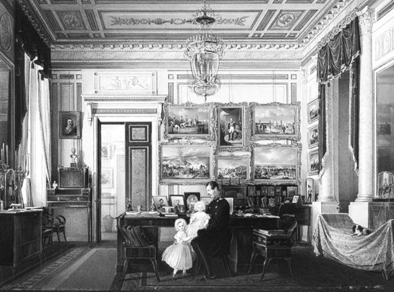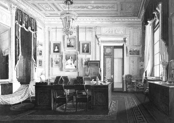 Дочь Николая I, великая княгиня Ольга Николаевна, в своих записках описывает кабинет отца «образца» 1838 г. совсем по-другому: «Светлое, приветливое помещение с четырьмя окнами, два с видом на площадь, два – во двор.