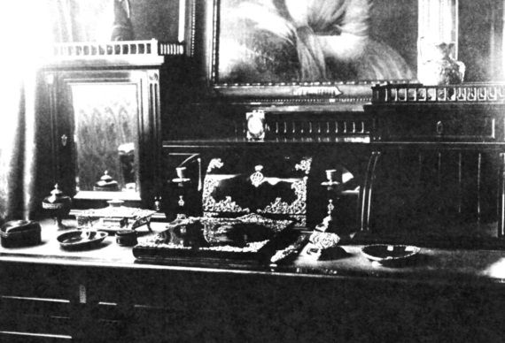 На фотографии кабинета, сделанной в 1920-х гг., интерьер – уже с существенными утратами. Со стены исчез портрет Николая I. Его заменяет портрет Марии Александровны. Из портретов на стене между альковами остался только Александр I. На столе – немногочисленные фотографии. Самым существенным дополнением стало появление еще одного стола, не просматривавшегося на более ранних фотографиях.