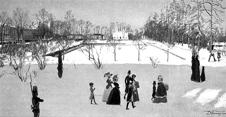Пока великий князь Павел Петрович не отъехал в Гатчину, он вел образ жизни, соответствующий его статусу наследника. Он виделся с матерью-императрицей ежедневно, утром и вечером, и допускался «в совет императрицы». В его комнатах в Зимнем дворце регулярно устраивались праздники, сопровождавшиеся танцами и трапезами. В воспоминаниях графини В. Н. Головиной упоминается, что в середине 1780-х гг. по понедельникам в Зимнем дворце на половине наследника устраивались балы и ужины[59]. Она же писала, что по субботам «у наследника устраивался прелестный праздник, который начинался прямо со спектакля. Бал, всегда очень оживленный, продолжался до ужина, подававшегося в той же зале, где играли спектакль. Большой стол ставился посреди залы, а маленькие столы в ложах. Великий князь и его супруга ужинали на ходу, принимая своих гостей в высшей степени любезно. После ужина бал возобновлялся и заканчивался очень поздно. Гости разъезжались при свете факелов, что производило очаровательный и своеобразный эффект на ледяной поверхности красавицы Невы»[60].