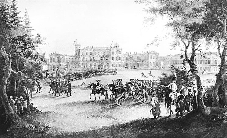Император Павел Петрович стремился установить четкий военный порядок и в придворной жизни. Графиня В. Н. Головина вспоминала, что «Император строго придерживался этикета: в глубокий траур не допускал ни балов, ни спектаклей – никаких удовольствий, кроме малых собраний, официальных приемов, тихих игр и ужинов»[71]. Об этом же писал К. Массон: «Внутри дворца был введен столь же строгий и страшный этикет. Горе тому, кто при целовании руки не стукался коленом об пол с такой силой, как солдат ударяет ружейным прикладом. Губами при этом полагалось чмокать так, чтобы звук, как и коленопреклонение, подтверждал поцелуй. За слишком небрежный поклон и целование камергер кн. Георгий Голицын был немедленно послан под арест самим Его Величеством»[72].