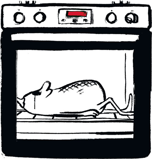 Мы по-прежнему предпочитаем именно этот способ, однако, если вы хотите избежать дыма в кухне и терпеть не можете лицезреть толстый слой обугленных остатков на сковороде, есть и другой метод: разогрейте духовку до 230 °C, включите конвекцию, разрежьте баклажаны вдоль пополам и сделайте на них глубокие надрезы крест-накрест. Натрите половинки баклажана маслом, поместите на застеленный пергаментом противень надрезами вверх и запекайте 40–45 минут; они должны стать мягкими и как следует подрумяниться. Выложите баклажаны в большую миску, накройте тарелкой и оставьте на 20 минут. Слейте жидкость, выньте мякоть ложкой, а кожицу и плодоножки выбросьте.