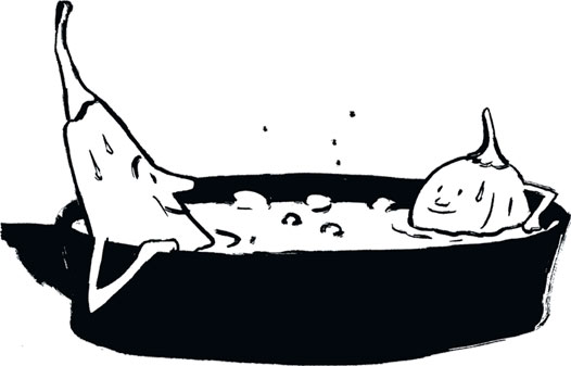 Настои не только переносят блюдо в дальние страны – они и вам помогут туда добраться, причем за небольшие деньги. Понадобится лишь простой набор: кастрюля, источник тепла, деревянная ложка для помешивания и шумовка. Ингредиенты для настоев часто бывают самыми простыми: чеснок, лук, сушеные специи, лимонные корочки, свежий или сушеный острый перец. Есть нечто приятное и демократичное в том, что в настоях используется несколько компонентов. Они не возвеличивают какой-то один ингредиент (как в случае с могущественным баклажаном, который после приготовления на открытом огне оказывается в центре внимания); в настоях смешиваются и обмениваются друг с другом ароматами группы самых обычных ингредиентов. В случае с настоями итоговая сумма больше, чем составные части, потому что время, температура и масло приводят к волшебной трансформации ингредиентов.
