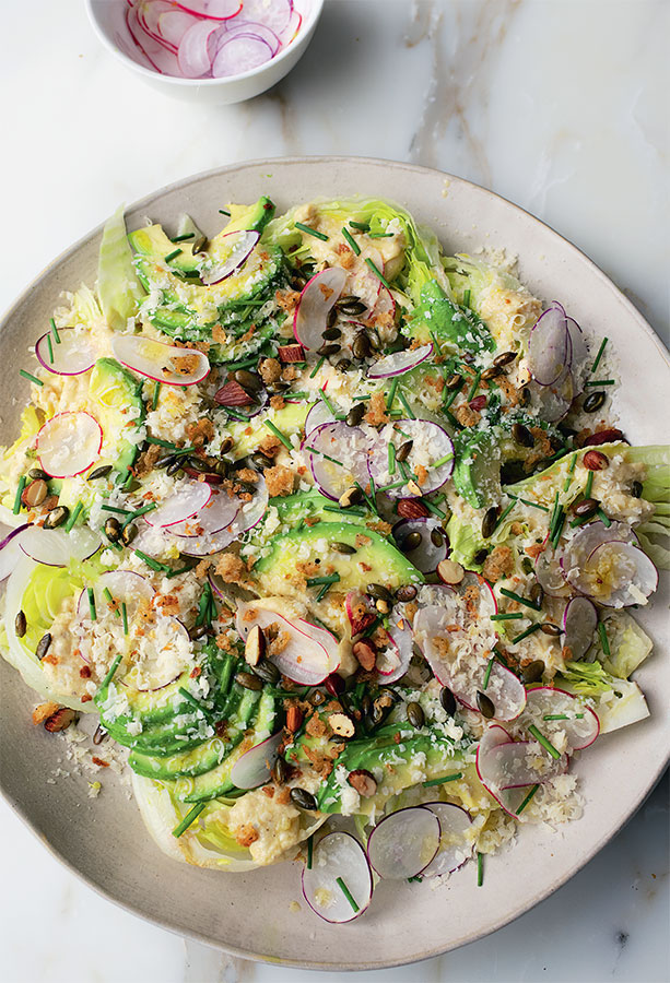 3. Выложите ломтики салата на большое блюдо, сбрызните 2 ст. л. масла и посыпьте солью и перцем. Выложите сверху баклажановый крем, посыпьте пармезаном, затем выложите ломтики редиса и авокадо. Слегка посолите и поперчите и полейте оставшимися 2 ст. л. оливкового масла. Украсьте шнитт-луком и щедрой порцией хрустящей посыпки, оставшуюся посыпку подайте отдельно.