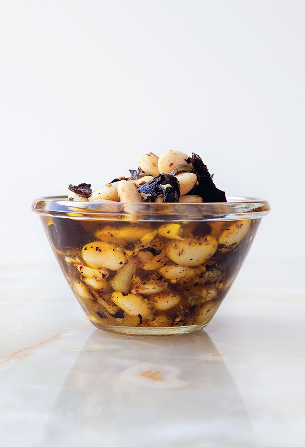 2. Влейте в сотейник 90 мл масла и поставьте на средний огонь. Как только масло нагреется, выложите лук и готовьте около 10 минут, время от времени помешивая, пока он не станет мягким и золотистым. Добавьте фасоль, чеснок и чили, бульон, 1 1/2 ч. л. соли и хорошенько приправьте свежемолотым черным перцем. Доведите до слабого кипения, убавьте огонь и готовьте еще 20 минут под крышкой, пока фасоль не станет совсем мягкой. Добавьте лимонный сок и цедру.