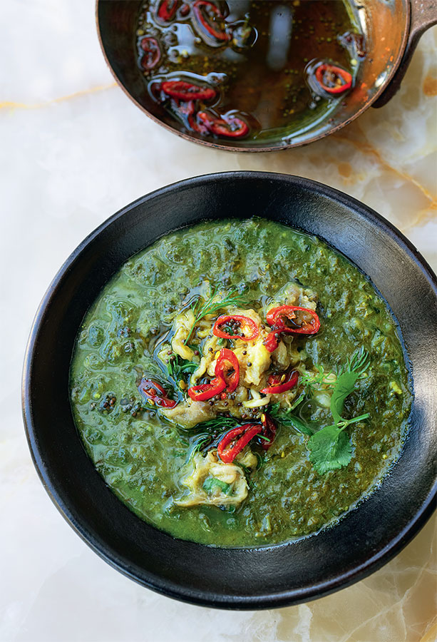 В этом супе используются кулинарные приемы Ближнего Востока и Индии: для основы мы обжариваем большое количество трав, обжигаем на открытом огне баклажаны, а в конце добавляем ароматное масло с обжаренными в нем специями. Такой суп особенно хорош с лимской фасолью в перечном масле – добавьте ее в тарелку с супом при подаче.