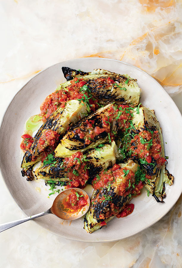 2. Смажьте капусту маслом и посыпьте солью. Выложите ее на очень горячую решетку барбекю или на сковороду-гриль и обжаривайте по 4–5 минут с каждой стороны (т. е. всего 12–15 минут), пока она не станет мягкой снаружи, оставшись при этом хрустящей, до появления четких полос от гриля. Выложите капусту на блюдо. Добавьте в соус нарезанную кинзу и ровным слоем разложите его поверх капусты. Подавайте теплой или комнатной температуры, украсив дольками лайма.