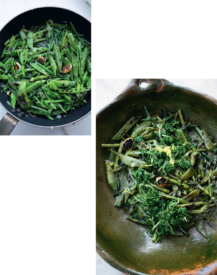 1. Поставьте на сильный огонь сотейник, для которого у вас есть крышка. Как только он задымится, добавьте четвертую часть фасоли обоих видов и готовьте около 5 минут, время от времени встряхивая сотейник, чтобы фасоль местами обуглилась. Выложите на противень или тарелку и обжарьте таким же образом остальную фасоль (если хотите ускорить процесс, используйте две сковороды). Добавьте чеснок и чили и готовьте таким же образом 3–4 минуты, пока они не почернеют со всех сторон, а потом выложите к фасоли. Дайте сотейнику слегка остыть.
