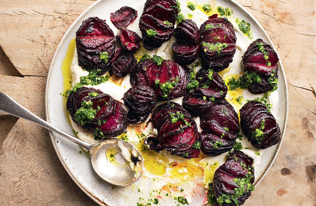 7. Перед подачей выложите на блюдо йогуртовый крем, поверх него свеклу, полейте ее сверху и вокруг маслом с противня. Сбрызните сальсой, оставшимися 2 ч. л. сока лайма и сразу подавайте.