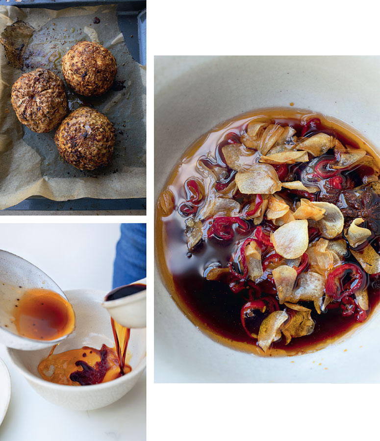 2. Для сладкой заправки нагрейте подсолнечное масло в маленькой кастрюле на среднем огне. Как только оно станет очень горячим, добавьте чеснок, чили и звездочки аниса и обжаривайте около 2–2,5 минуты, помешивая, чтобы кусочки чеснока не слипались. Чеснок должен стать хрустящим и бледно-золотистым (он продолжит менять цвет после того, как вы вынете его из масла, так что не держите его там слишком долго). Процедите масло через сито в маленькую жаропрочную миску, чеснок и чили отложите для подачи. 80 мл ароматного масла отлейте и используйте для других рецептов. Оставшиеся 40 мл смешайте с остальными ингредиентами для заправки.