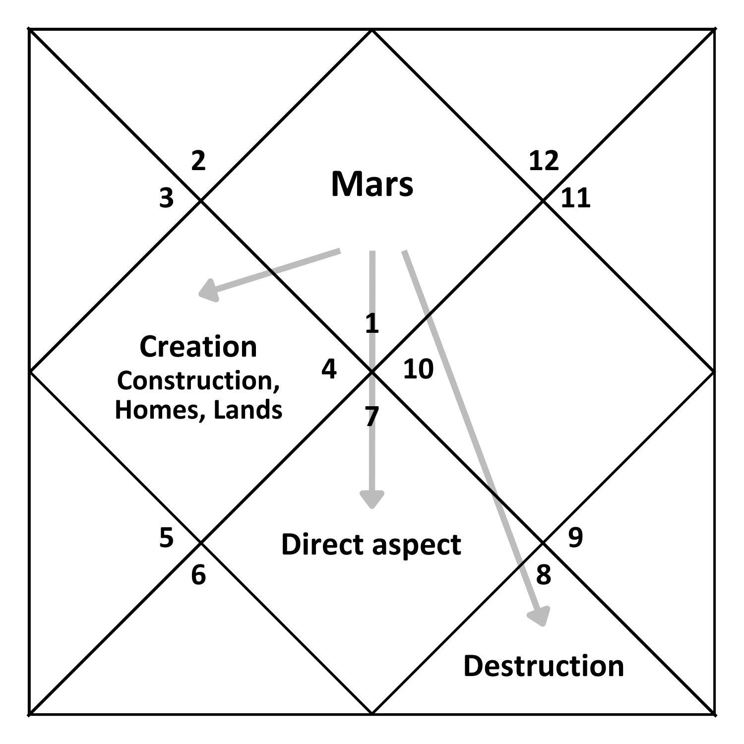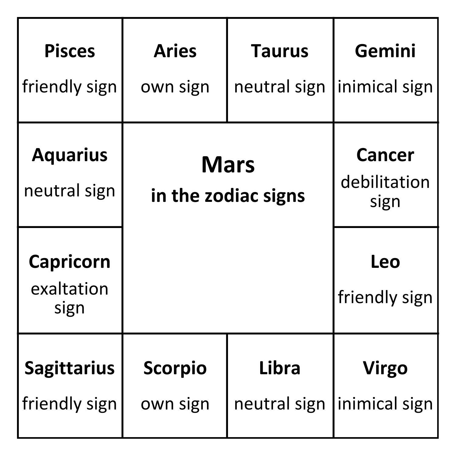 The inimical signs for Mars are Gemini and Virgo. These are the worst positions, as they deprive Mars of much of its potential.