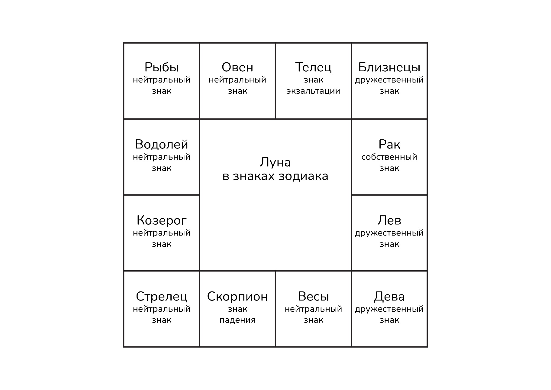 Овен, Весы, Стрелец, Козерог, Водолей и Рыбы являются нейтральными знаками для Луны, то есть в них Луна не получает особой силы и не отдаёт её.