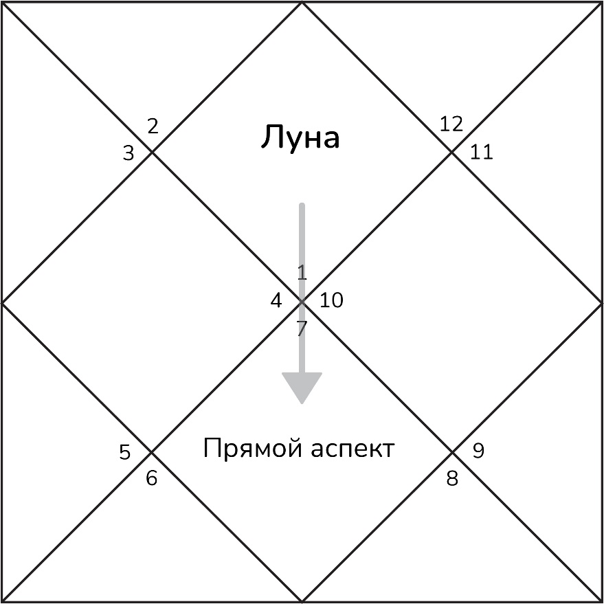Транзитная Луна даёт прямой аспект на седьмой дом от себя. Рассматривая транзиты Луны, необходимо учитывать не только знак, в котором она находится, и его управитель, но и аспекты других транзитных планет, и планет натальной карты на Луну. Особое внимание следует уделить планетам, находящимся рядом с транзитной Луной.
