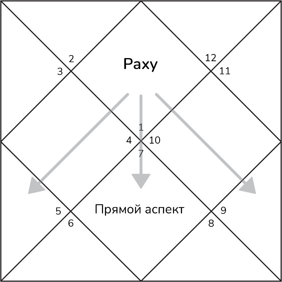Раху даёт прямой аспект на седьмой дом от себя (у вас это шестой дом), а также аспектирует пятый дом от себя (у вас это четвёртый дом – эмоции, счастье в целом, мать, семья, недвижимость, автотранспорт) и девятый дом от себя (у вас это восьмой дом – неожиданные деньги или ситуации, наследство, деньги партнёра по браку или бизнесу, родители и родственники партнёра по браку, тайны, эзотерика, сексуальность).
