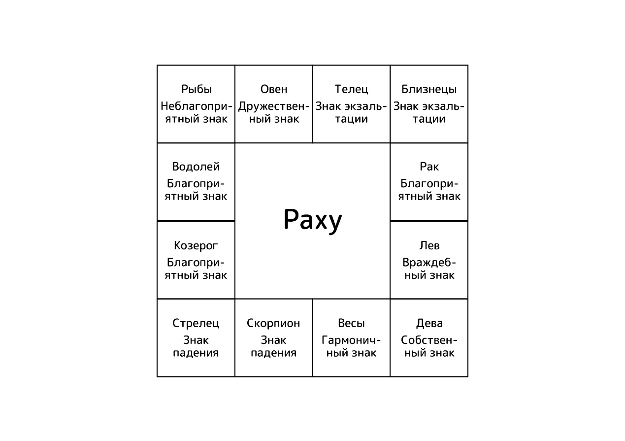 Ниже на рисунках есть информация по поводу того, как проявляются Раху и Кету в разных знаках. Мнения астрологов не всегда однозначны на этот счёт. Кармические узлы всегда дают иллюзии, поэтому даже в благоприятном месте могут негативно влиять на живые показатели гороскопа, портить отношения, кого-то или что-то отнимать, часто для того, чтобы человек развивался, двигался туда, куда нужно.