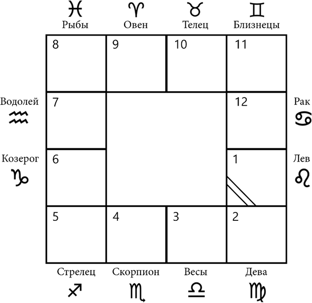 Здесь приведён пример Ведического гороскопа с асцендентом во Льве. Асцендент обозначается двумя параллельными линиями. Его также называют лагной, восходящим знаком или первым домом. От асцендента ведётся счёт по часовой стрелке от первого до двенадцатого дома гороскопа. Каждый дом попадает в какой-то знак. Знаки имеют своё постоянное место, как это изображено на рисунке. Рассчитав свой гороскоп, вы получаете так же расположение планет в домах:
