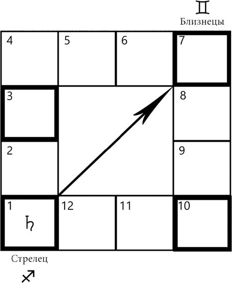 Рассмотрим, что будет происходить, если в Стрельце, там, где проходит транзит Сатурна, есть в натальной карте планеты. Сатурн аспектирует (оказывает влияние) первый, третий, седьмой, десятый дом от своего положения. Самое сильное влияние будет на оси Стрелец – Близнецы.
