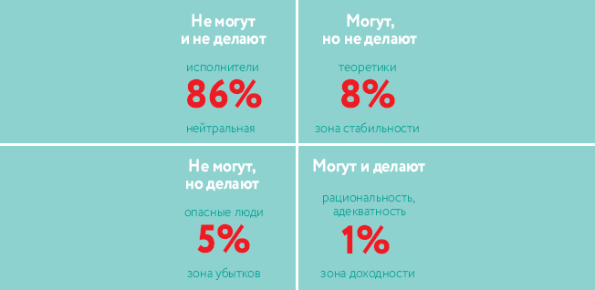 Этот квадрат, созданный на основе моего личного опыта, дан для анализа ситуации и помощи предпринимателям в оценке своих способностей, а также для выбора верного вектора развития. На основе данной матрицы наглядно видно: среди тех, кто действует, большая часть мало на что способны, а те, кто способен на многое, как правило, бездействуют. Именно поэтому говорят, что сегодня в России неконкурентоспособный рынок. Так что нелишне и повторить: сверхдоходы получают те, кто всегда готов пойти на риск (рис. 1.2).