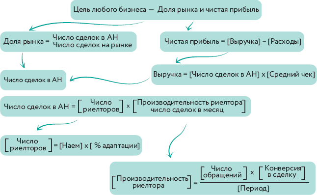 Большинство бизнесменов ошибочно предполагает, что роль маркетинга в агентстве недвижимости сводится лишь к привлечению клиента. Некоторые добавляют к этому еще параметр «удержание клиента», что выражается конверсией в сделку. Но в нашем бизнесе эти параметры отражают действительность далеко не полностью, что легко доказать. Если бы нашими задачами были лишь привлечение клиентов и их конверсия в сделку, мы легко могли бы увеличить обороты вдвое, всего лишь удвоив входящий поток клиентов. На деле же вместе с ростом обращений клиентов снижается конверсия, и итоговое влияние на результат может быть условно положительным, нулевым и даже отрицательным. Стало быть, формула усложняется: добавляются такие переменные, как количество риелторов, способных обрабатывать поток входящих обращений, не теряя в качестве. А эти параметры определяются объемом найма, скоростью выхода на целевую производительность и удержанием (снижением текучести).