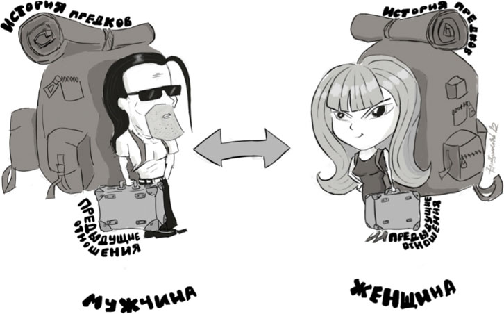На отношения мужчины и женщины влияют, во-первых, история предков каждого из них, во-вторых, личная история прошлых отношений.