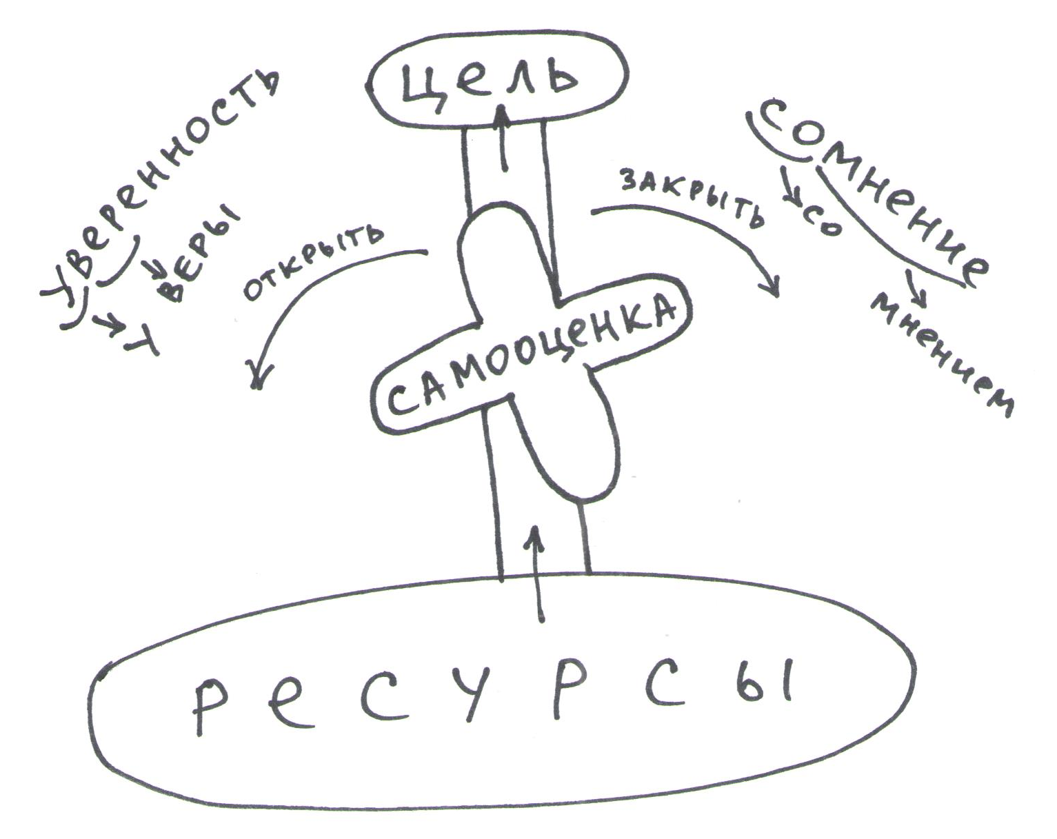 Как видите, стоило цели измениться, старик пересмотрел своё отношение к ресурсам. То есть его самооценка очень быстро изменилась. Самооценка в этой триаде (цель-самооценка-ресурсы) вообще самое сомнительное (подвижное, нестабильное) звено. Поэтому я поменяю структуру уверенности на вот такую: