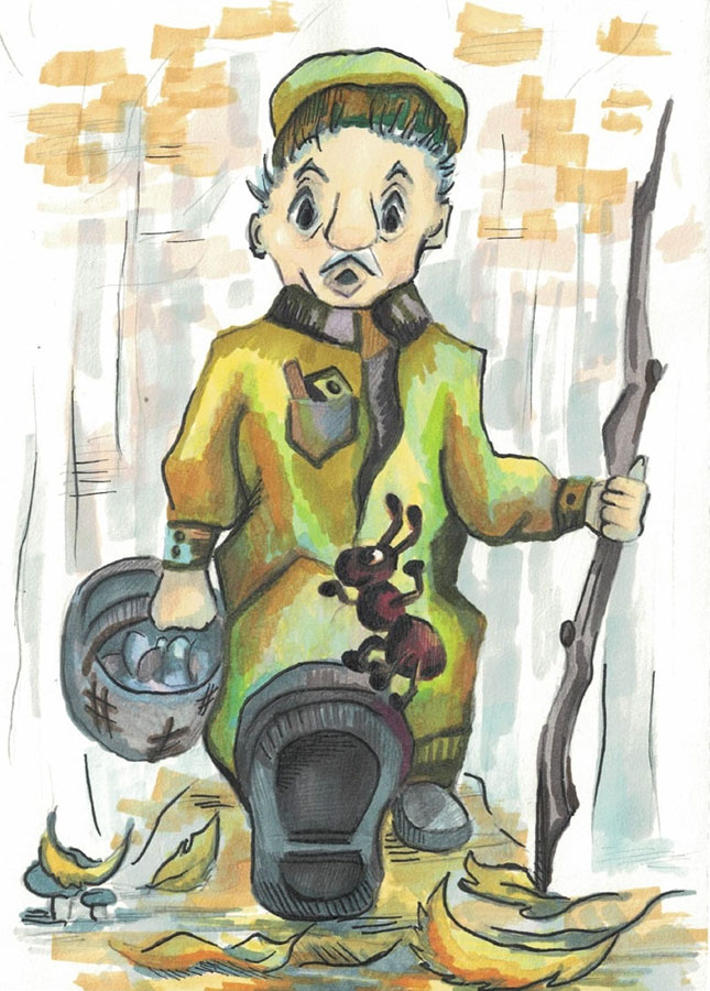 Человеку, который наблюдал за всем этим, что-то не понравилось в происходящем. Он со злостью начал палкой и ногами крушить жилище муравьев. От страха обитатели муравейника стали разбегаться кто куда, спасаясь от гнева грибника. Только один муравей, тот самый, которого к домику тащил муравей-страж, воспользовавшись суматохой, ускользнул от своего охранника и побежал не прятаться, а, наоборот, в сторону человека. Уворачиваясь от ударов палки, он улучил момент и запрыгнул в обувь грибника.