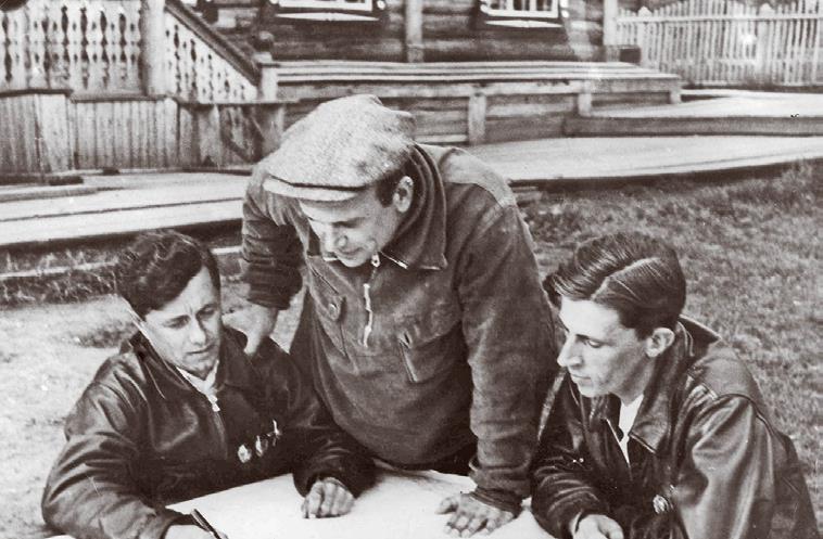 Слева направо: полярный летчик М. И. Козлов, начальник экспедиции А. Д. Алексеев и штурман самолета И-172 Н. М. Жуков. Из домашнего архива Д. А. Алексеева