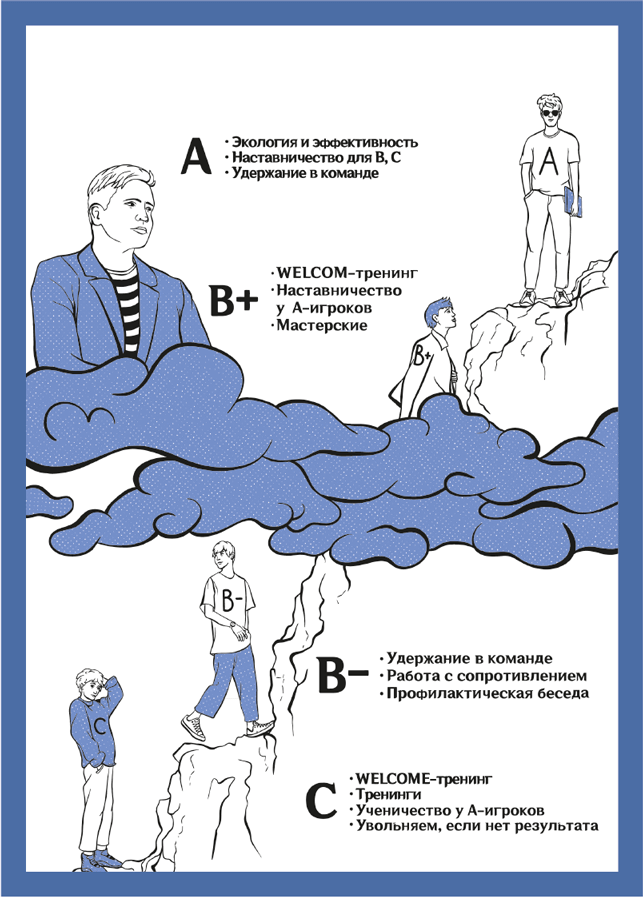 Самая сложная задача – поднять игроков из группы С. К сожалению, вернуть горящие глаза достаточно сложно, когда человек негативно относится к инициативам компании и ее продуктам, когда это B–. Если руководитель все же видит потенциал работника и считает, что его можно вернуть в команду, то проблему нужно проговорить с ним лично, постараться выяснить причины низких результатов и отсутствия должной вовлеченности, обсудить возможные выходы из ситуации. И если огонек внутри человека все еще тлеет, то потребуется искра, чтобы вновь его разжечь. Стратегия руководителя будет заключаться в том, чтобы сначала поднять С-игрока до уровня B+, а потом вести его на вершину А. Можно организовать обучение или тренинг, где человек научится позитивно относиться к сложным ситуациям, можно сделать ставку на наставничество со стороны А-игрока, который попробует расшевелить энтузиазм коллеги, заразив его своей энергией… Но если время идет, а принятые меры не помогают обнаружить скрытые резервы, то с C-игроком нужно прощаться. Особенно безнадежны ситуации, когда игрок опустился на С с уровня B–. Возвращать его в прежнюю парадигму результативного недовольства будет малоэффективно. Здесь руководитель должен быть достаточно жестким, чтобы объяснить, что лояльность будет ключевым условием продолжения работы в команде.