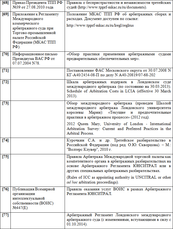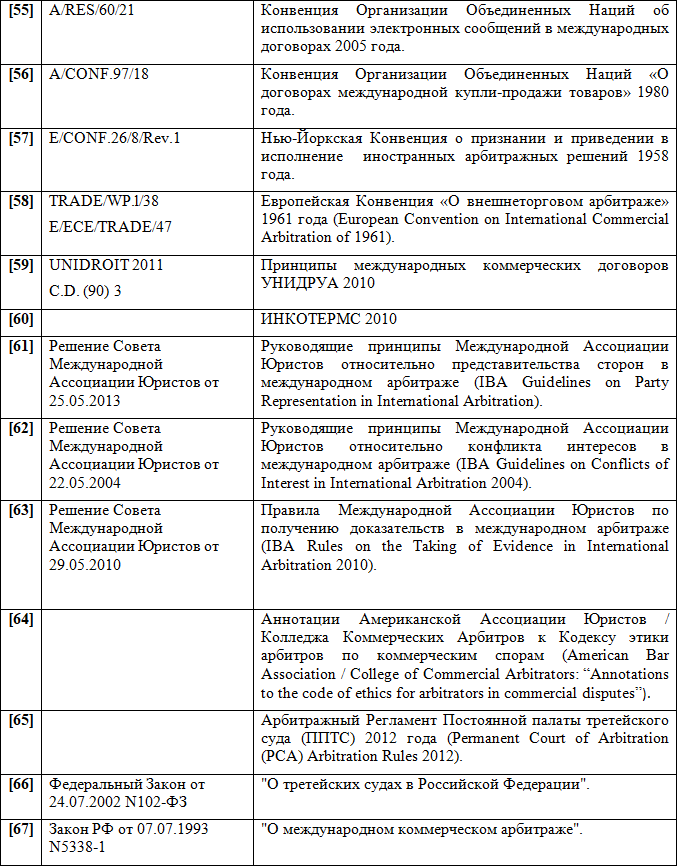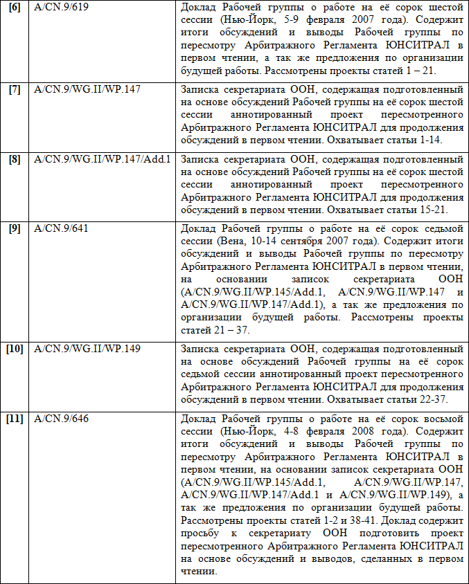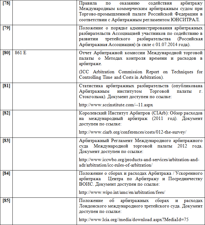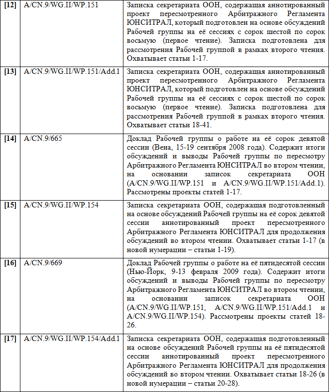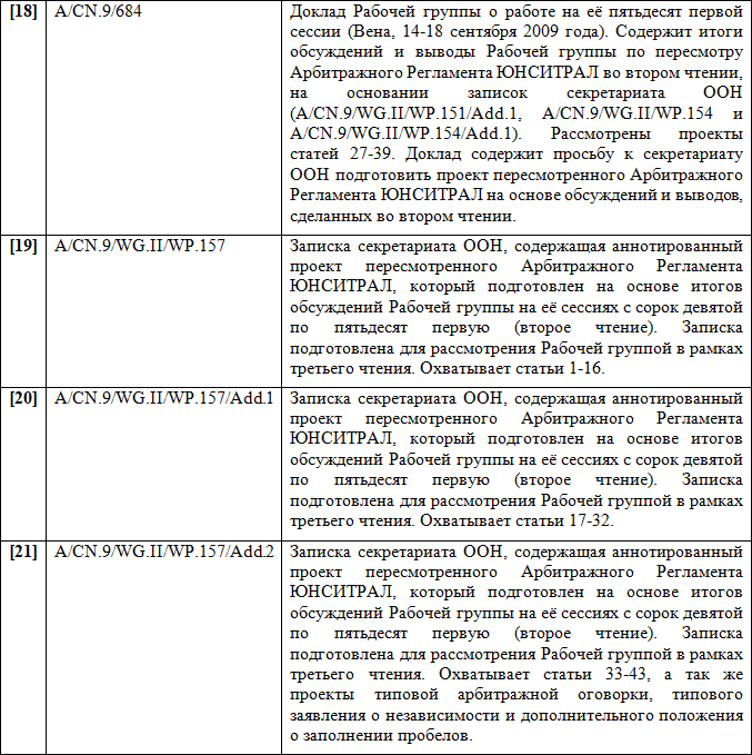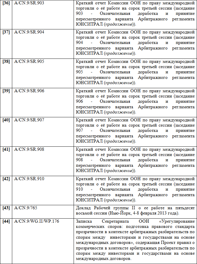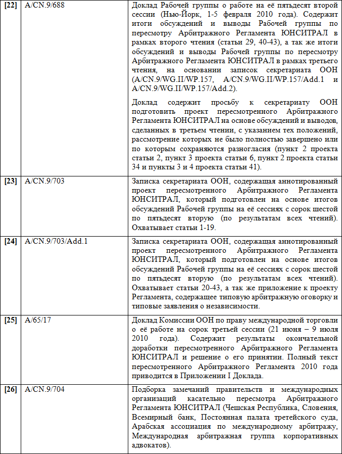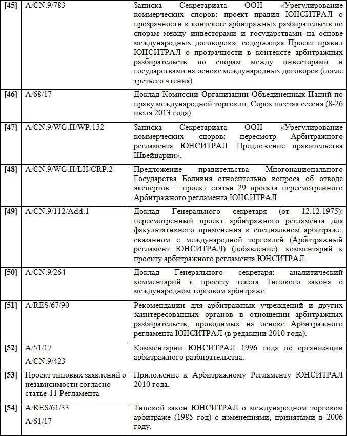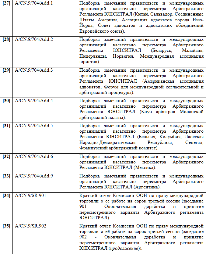 Следует заключить, что Арбитражный Регламент ЮНСИТРАЛ 1976 г. можно по праву считать одним из самых удачных частноправовых инструментов в сфере альтернативного разрешения споров – он применялся в каждом четвертом крупном международном арбитражном процессе.