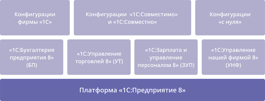 Программные продукты 1С – это технологическая платформа и разработанные на её основе прикладные решения («конфигурации»). Конфигурация устанавливается на платформу и не работает без неё. Конфигураций много, но платформа одна. Программист 1С может доработать прикладное решение под индивидуальные задачи компании, но платформа останется неизменной.