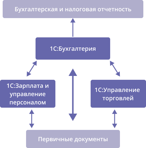 Между системами может быть налажена взаимосвязь, которую можно показать на примере. Предположим, что на предприятии установлены «1С: Управление торговлей», «1С: Бухгалтерия» и «1С: Зарплата и управление персоналом». На предприятии есть первичные документы, которые заводятся в УТ и ЗУП. Они обмениваются данными с «1С: Бухгалтерия», в которой на основании полученных данных формируются бухгалтерские и налоговые отчёты. При помощи специального функционала отчёты отправляются из программы прямо в налоговую. Вот такая взаимосвязь систем.