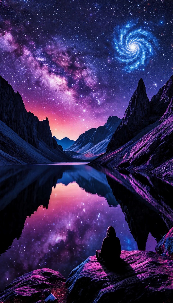Ночное небо расцветало яркими красками. Всё казалось близким как никогда: далекие галактики, туманности, созвездия и планеты, грозно нависающие над раскинувшимися вокруг скалами. В их объятьях притаилось озеро. Своей гладью оно старательно подражало небу, словно пытаясь слиться с ним. Свежий ветер своим ароматом навевал мысли о бесконечной вселенной. О том, что все наши проблемы и трудности – лишь маленькие песчинки в необъятном океане жизни.