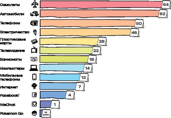 Автомобили охватили 50 млн клиентов только через 62 года с момента изобретения. Телефоны появились в 50 тыс. домов уже через три года (рис. 1.1).
