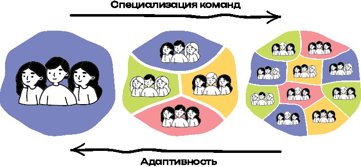 Это значит, что команды должны уходить от излишней специализации и уметь работать с разными задачами по продукту. В основе адаптивности лежат доменные и технические знания по областям продукта.