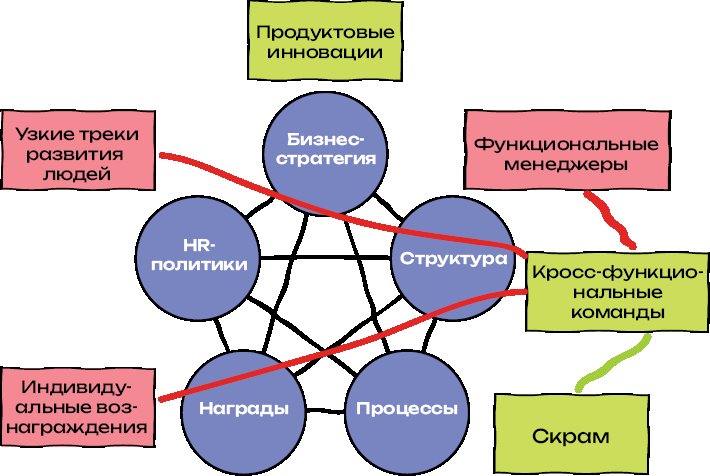 К несогласованному организационному дизайну могут также приводить изолированные инициативы по внедрению отдельных практик. Например, OKR без соответствующих изменений в структуре, наград и HR-политик. Или внедрения Скрам и Канбана без изменения системы вознаграждений и HR-политик.