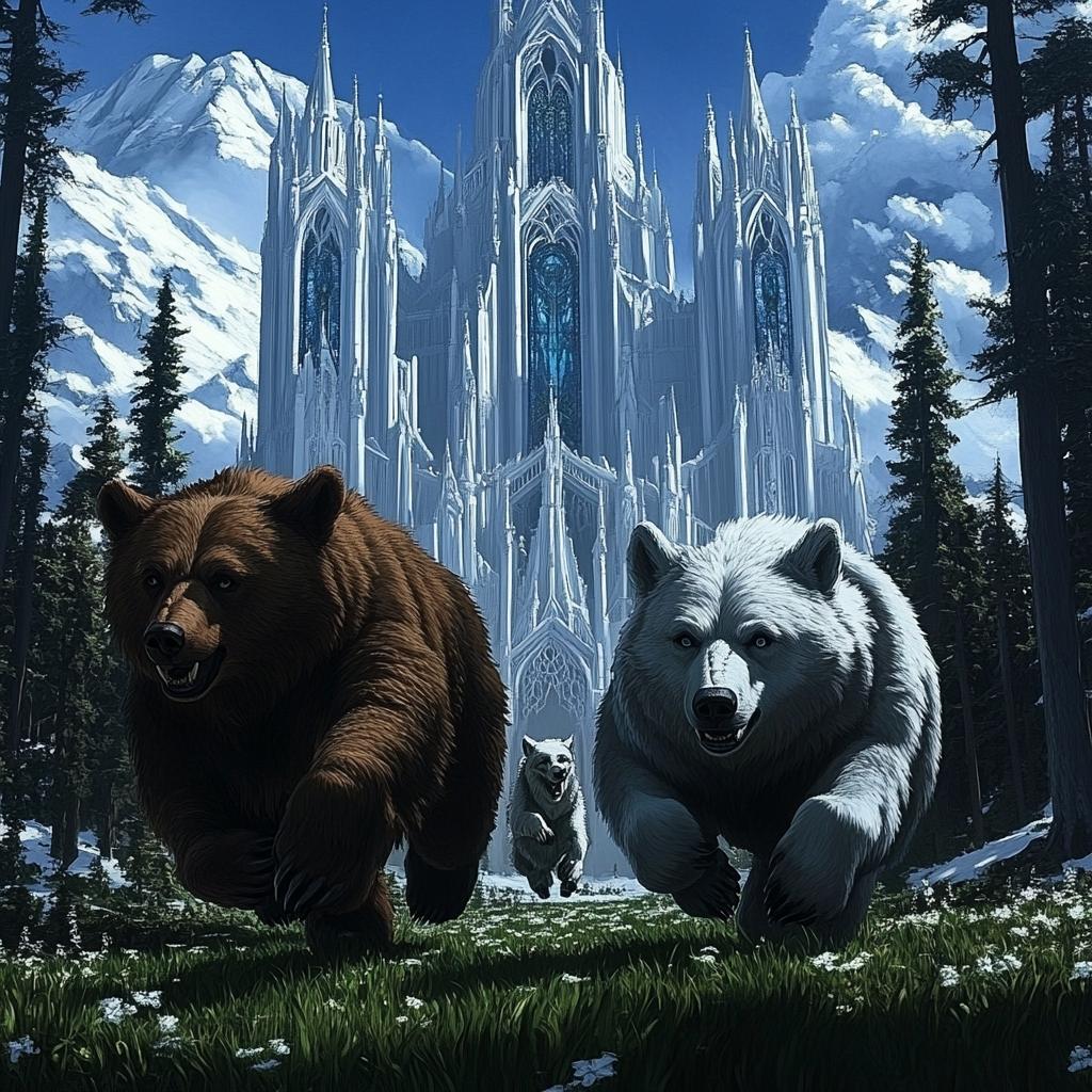 Но не успели мы пройти и пары шагов, как увидели, что в нашу сторону из-за храма вышли белый и бурый медведи и один большой белый с серым волк.
