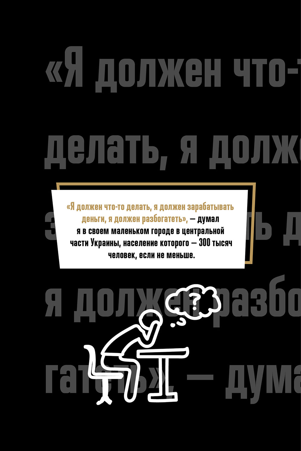 Но началось все намного раньше. Сколько себя помню, я всегда хотел быть предпринимателем. Едва я научился говорить и что-то соображать, как осознал для себя эту важную вещь. Скорее всего, поначалу я и слова такого не знал – «предприниматель», но тянуло меня именно в этом направлении. «Я должен что-то делать, я должен зарабатывать деньги, я должен разбогатеть», – думал я в своем маленьком городе в центральной части Украины, население которого – 300 тысяч человек, если не меньше.