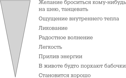 Мы часто замечаем некое чувство, когда оно уже набрало силу. Если принять отсутствие чувства за 0, а 10 – за наиболее интенсивное его проявление, то 5 – это тот момент, когда мы обнаруживаем его. Возьмем, к примеру, радость: она начинается с того, что нам становится хорошо. В наиболее интенсивном ее проявлении нам хочется петь, танцевать и броситься кому-нибудь на шею