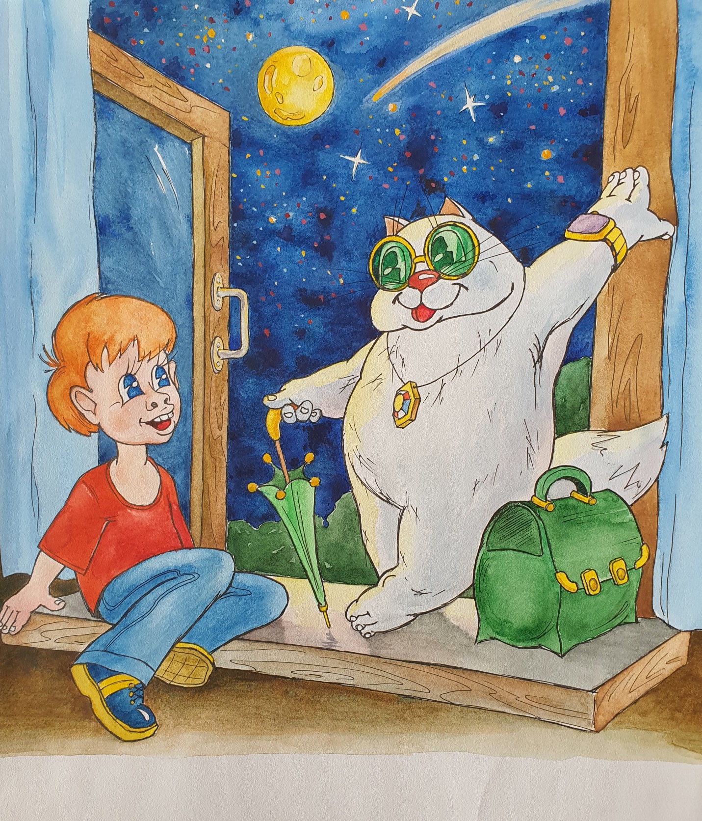 Больше всего Бубоньку удивило не само появление котёнка, а то, что он был белый, словно порция воздушной сладкой ваты, в больших зелёных очках, с часами на толстенькой лапке и с медальоном на шее. Незнакомец плутовато глянул на мальчика, мяукнул и на глазах стал расти. И превратился в огромного пушистого кота.