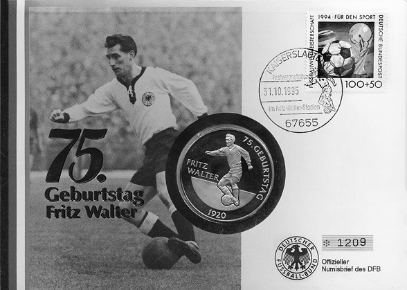 Конверт первого дня в честь 75-летия Фрица Вальтера. 1995