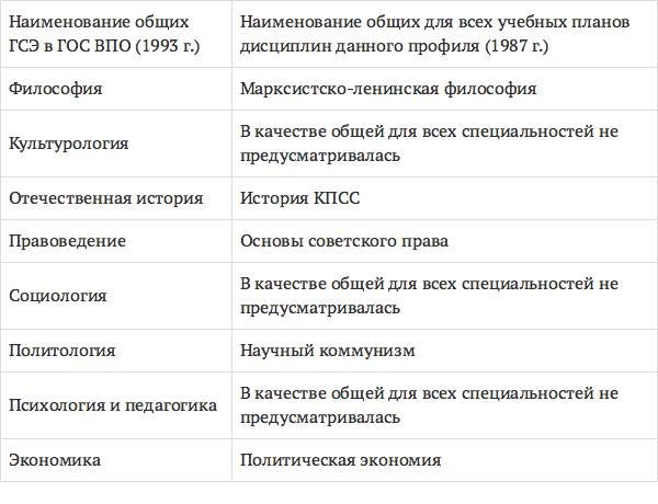 Как видно из таблицы № 1, из учебных планов были исключены общественно-политические дисциплины (история КПСС, научный коммунизм, партийно-политическая работа) и внесены дисциплины: отечественная история, политология, социология, философия, культурология, русский язык и культура речи и другие, ориентированные на культурное развитие личности специалиста в вузе. Исследования показывают, что стандартизация должна устанавливать общие государственные требования к минимуму содержания и уровню подготовки специалистов по конкретным направлениям (специальностям) высшего профессионального образования в качестве федерального компонента. При таком подходе стандартизация не исключает свободу вузов в проектировании подготовки специалистов, она не сводится к жесткому регламентированию деятельности высшей школы.