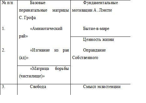 Далее представлено экзистенциальное содержание соотнесённых базовых перинатальных матриц и фундаментальных мотиваций.