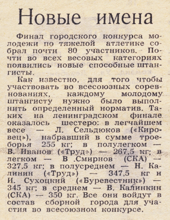 Для того чтобы участвовать во всесоюзных соревнованиях, каждому молодому тяжелоатлету нужно было выполнить определенный норматив. Таких на ленинградском финале оказалось шестеро: