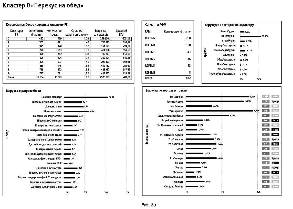 ПРИМЕР № 2Реализуя проект для сети быстрого питания, мы выделили 11 устойчивых JTBD, построенных на оценке регулярности и времени визита, структуры покупок, возрасте клиентов и так далее. На основании данной сегментации каждый чек гостя мог быть соотнесен с одним из 11 сегментов и с конкретной точкой продаж. Учет вклада конкретного JTBD в структуру розничного товарооборота точки, в свою очередь, позволил нам разложить около трех десятков точек сети на шесть групп (например, точки с преобладающими чеками для JTBD «сытный недорогой ужин после учебы»). Этот подход помог клиенту уйти от печати одинаковых POS-материалов и подойти к запуску и поддержке промоакций для каждой точки более осознанно и осмысленно (рис. 2a, b).