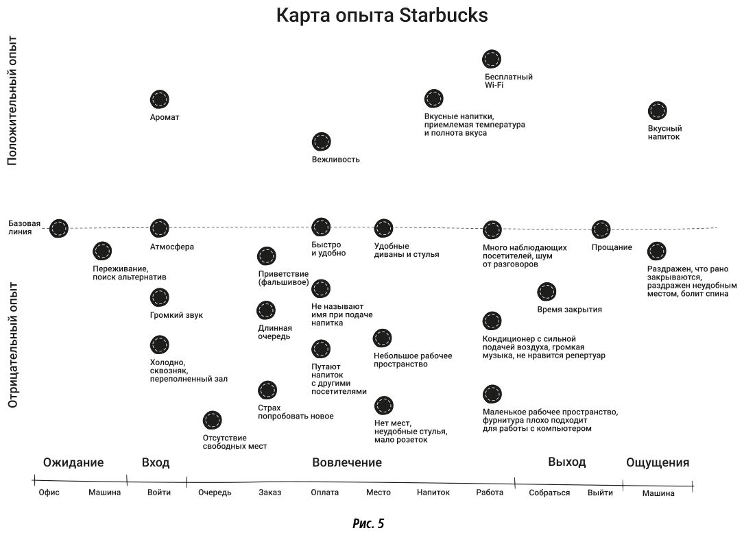 Органический подход – метод описания путешествия потребителя на основании того, как клиент реально взаимодействует с компанией на каждом этапе любого процесса. Это буквально физический маршрут отдельно взятого человека. Данный способ не универсален и применим, главным образом, для предприятий розничной торговли, ресторанов и отелей. В его основе лежит мысль, что потребительское путешествие строится с нуля для каждой компании. Чтобы построить путешествие в органической логике, нужно прежде всего понаблюдать за клиентом и «походить в его ботинках». Яркий пример органического подхода – Starbucks. Если взглянуть на карту путешествия потребителя Starbucks, видны этапы физического перемещения пользователя (рис. 5).