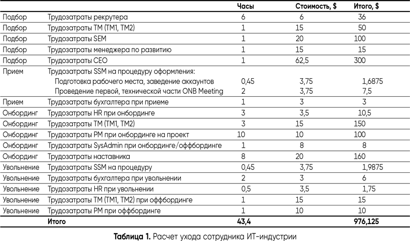 2. Если вы руководитель отдела HR, это отличная возможность показать значимость своего отдела, ведь мы же все понимаем, что в представлении большинства людей в компании (в том числе и руководителей) сотрудники HR – это нахлебники. Поменять подобное представление всегда помогают реальные цифры (табл. 1).