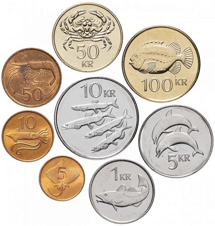 Каждому из нас на заходе была выдана валюта взамен суточных. Выдавали исландские кроны. Приятно удивил вид монет. На монетах разного достоинства выбиты различные животные: треска, дельфины, мойва, краб, пинагор. А на местных «копейках» – эйре – выбиты скат, кальмар, креветка (с 1995 года эйре вышли из обращения).
