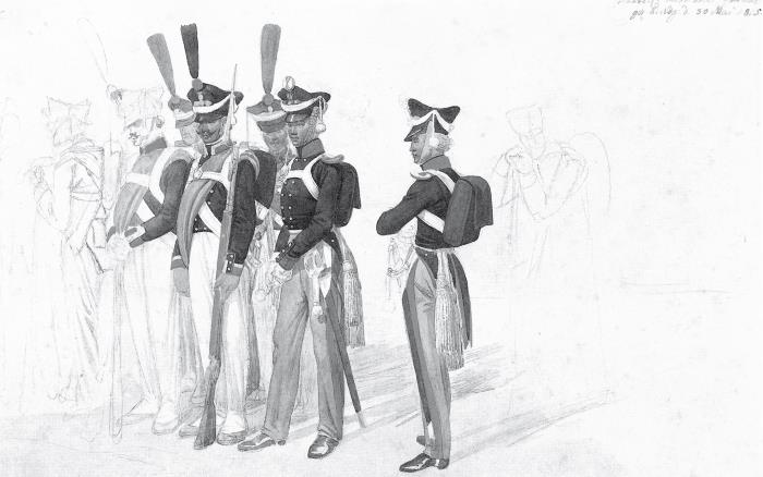 Гренадеры, унтер-офицер и обер-офицеры гренадерской роты. И. А. Клейн. 1815 г. Городской исторический музей г. Нюрнберга. Германия.