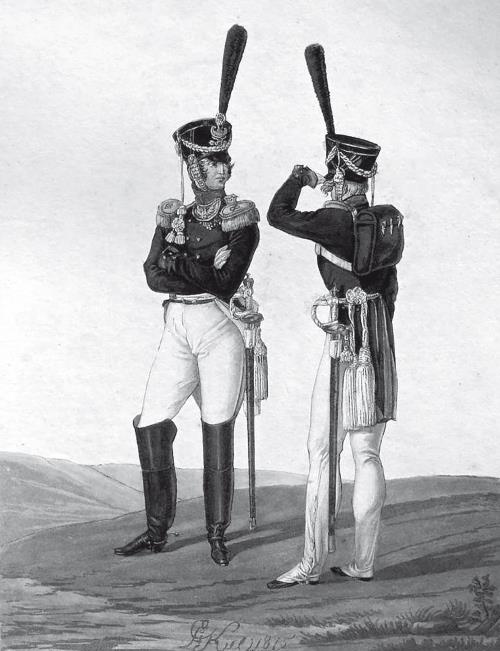 Ротой командовал капитан или штабс-капитан, которому помогали поручик, подпоручик и прапорщик. Помимо 48 обер-офицеров, состоящих в ротах, 2 поручика или подпоручика назначались на должности полковых казначея и квартирмейстера, а 4 подпоручика или прапорщика – на должности шефского, полкового и батальонных адъютантов. В ведении казначея состояли «жалованная, амуничная, полковая сумма и амуниция», в ведении квартирмейстера – «провиант и фураж или деньги, на то отпускаемые». О сложностях адъютантской службы рассказывал полковой адъютант 50-го егерского полка Андреев: «Очень я доволен был, что избавился от адъютантской должности: на месте все бы ничего, а походом каторга; было время, что сам не раздевался и лошадь не расседлывал по два месяца. Полковой адъютант в канцелярии и батальонной, по приходе на место, нарядить должен команды за дровами и водой с офицером, после ехать в дивизионную квартиру за приказанием, а нередко и в корпусную. Поди, отыщи и там дожидайся, пока приказы будут. Их нужно выписать и отвезти к начальству, к бригадному и полковому, после собрать фельдфебелей, отдать приказание, а глядишь уже свет и в поход. Спал я часто верхом, и с боку солдаты придерживали; хуже не было в полку должности моей» [87, стр. 195]. Полковой адъютант, казначей и квартирмейстер числились в 1-й гренадерской роте, адъютант 2-го батальона – в 4-й мушкетерской, а адъютант 3-го батальона – в 3-й гренадерской.