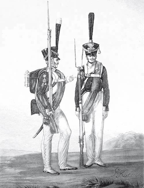 Строевой младший командный состав делился на старших и младших унтер-офицеров и ефрейторов (старшие ефрейторы также назывались вице-унтер-офицерами). К старшим унтер-офицерам относились фельдфебели, портупей-прапорщики, подпрапорщики (в егерских полках – портупей-юнкера и юнкера) и каптенармусы. Должность фельдфебеля состояла в том, «чтоб подавать дневные рапорты от роты Капитану или ротному Командиру и Адъютанту батальонному, сочинять месячные списки и все случающиеся рапорты, принимать и раздавать на роту получаемые деньги, записывать полковые приказы, и все исправлять, что до роты касается» [75, стр. 2]. Звания портупей-прапорщиков и подпрапорщиков (портупей-юнкеров и юнкеров) предназначались для дворян, готовящихся к получению офицерского чина; при недостатке таковых в полку их место занимали младшие унтер-офицеры из недворян. В каждой роте старший унтер-офицер, следящий за состоянием оружейных и амуничных вещей, именовался каптенармусом. Про эту должность в Уставе 1797 г. говорилось: «Каптенармусу не ходить на караул, а осматривать ему, когда при роте дела не имеет, в вечеру и поутру, после зорей, свою роту, иметь ему под собою ротное Казначейство, ему же принимать и отпускать все амуничные вещи, и отдавать отчет Капитану, или ротному Командиру» [75, стр. 3]. Один из младших унтер-офицеров в роте исполнял должность квартирьера и был обязан «на походе разбивать лагерь… принимать… в городах и деревнях квартиры, фураж и провиант». Ефрейторы (вице-унтер-офицеры) назначались из самых достойных рядовых и при недостатке унтер-офицеров занимали их места.