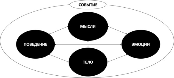 Рис. 2. Взаимосвязь мыслей, эмоций, телесных и поведенческих реакций